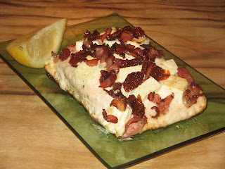 6. Place fish under the broiler for approximately 13 minutes, remove from oven, sprinkle on the bacon and cheese an return to oven for another 2-5 minutes until cooked (depending on thickness of salmon).