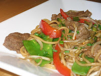 5. Return beef with bean sprouts, snow peas, noodles and chives, cook until hot and remaining veg are just tender.