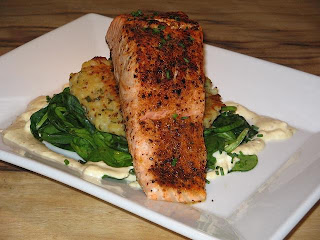 To serve drizzle sauce on plate, place spinach, then potato cake, then salmon.