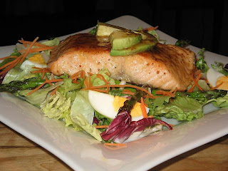 5. Slide pancake turner between salmon and skin to remove each piece from skin. On 4 plates, divide salad greens, carrots and egg. Top with asparagus then the salmon. Sprinkle with pepper. Serve with remaining dressing.